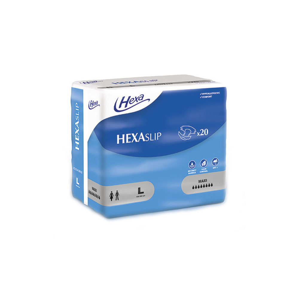 « Protections complètes. Incontinence sévère. Pour personnes à mobilité réduite ou alitées. Pourquoi choisir la Gamme HexaSlip ? La gamme HEXASlip Maxi pour incontinence sévère urinaire et/ou fécale s’adresse aux personnes ayant une mobilité réduite et pour qui l’accompagnement aux toilettes n’est pas possible. Ces protections sont dotées d’un voile d’acquisition qui procure le confort de l’effet garde au sec tout en protégeant la peau de l’utilisateur. L’enveloppe extérieure au toucher très doux et respirable permet de préserver l’intégrité cutanée. La découpe anatomique du tampon absorbant plus large à l’arrière facilite la pause de la protection et améliore sa capacité d’absorption pour répondre à des temps de pose qui peuvent se prolonger, notamment la nuit et en position couchée. Les attaches « »Combi Flex » » avec colle et crochets permettent d’être repositionnables sur l’ensemble de la protection. Ce produit hypoallergénique est testé sous contrôle dermatologique et réduit considérablement le risque de réactions allergiques. Le bon choix de la taille et une pose appliquée sont essentiels pour garantir l’efficacité de la protection HEXASlip. Avantages des protections complètes HEXASlip Maxi • Fort degré d’absorption (2190/3370/3550 mL) • Produit facilement repositionnable • Toucher très doux pour le confort de la peau • Effet garde au sec instantané Quelle taille choisir pour les protections HexaSlip Maxi ? Les protections contre l’incontinence HexaSlip Maxi sont disponibles en quatre tailles : S, M, L et XL. Pour déterminer la meilleure taille pour vous, il suffit de mesurer votre tour de hanche : Taille S : Idéale pour les hanches de 60 à 100 cm Taille M : Idéale pour les hanches de 90 à 130 cm Taille L : Idéale pour les hanches de 105 à 150 cm Taille XL : Idéale pour les hanches de 110 à 160 cm »